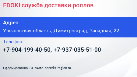 EDOKI, служба доставки роллов по адресу Ульяновская область, Димитровград, Западная, 22 в дальнейшем Организация, размещена в следующих категориях: