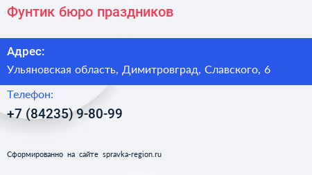 Фунтик, бюро праздников по адресу Ульяновская область, Димитровград, Славского, 6 в дальнейшем Организация, размещена в следующих категориях: