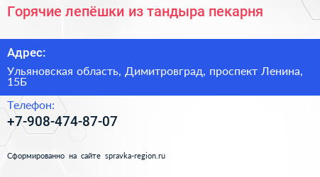 Горячие лепёшки из тандыра, пекарня по адресу Ульяновская область, Димитровград, проспект Ленина, 15Б в дальнейшем Организация, размещена в следующих категориях: