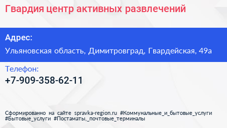 Гвардия, центр активных развлечений по адресу Ульяновская область, Димитровград, Гвардейская, 49а в дальнейшем Организация, размещена в следующих категориях:
