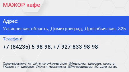 МАЖОР, кафе по адресу Ульяновская область, Димитровград, Дрогобычская, 32Б в дальнейшем Организация, размещена в следующих категориях: