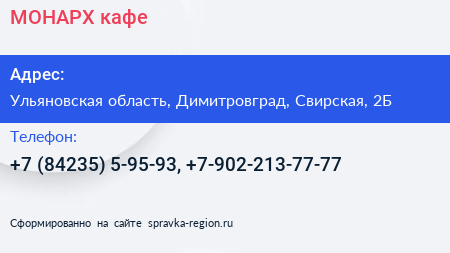 МОНАРХ, кафе по адресу Ульяновская область, Димитровград, Свирская, 2Б в дальнейшем Организация, размещена в следующих категориях: