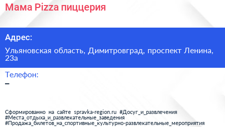Мама Pizza, пиццерия по адресу Ульяновская область, Димитровград, проспект Ленина, 23а в дальнейшем Организация, размещена в следующих категориях:
