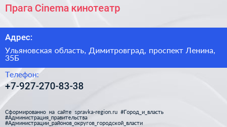 Прага Cinema, кинотеатр по адресу Ульяновская область, Димитровград, проспект Ленина, 35Б в дальнейшем Организация, размещена в следующих категориях: