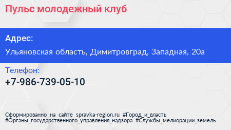 Пульс, молодежный клуб по адресу Ульяновская область, Димитровград, Западная, 20а в дальнейшем Организация, размещена в следующих категориях: