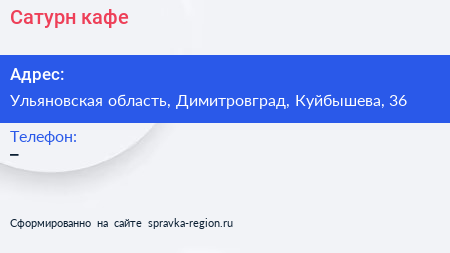 Сатурн, кафе по адресу Ульяновская область, Димитровград, Куйбышева, 36 в дальнейшем Организация, размещена в следующих категориях: