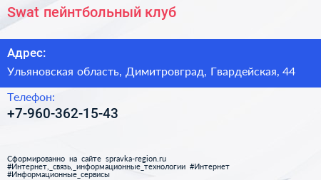 Swat, пейнтбольный клуб по адресу Ульяновская область, Димитровград, Гвардейская, 44 в дальнейшем Организация, размещена в следующих категориях: