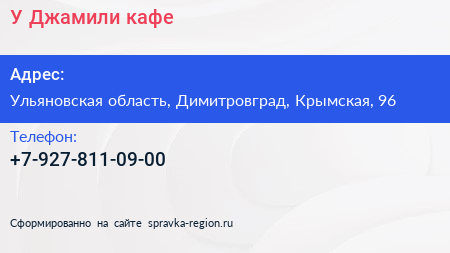 У Джамили, кафе по адресу Ульяновская область, Димитровград, Крымская, 96 в дальнейшем Организация, размещена в следующих категориях: