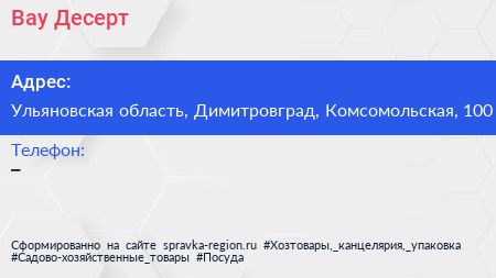 Вау! Десерт по адресу Ульяновская область, Димитровград, Комсомольская, 100 в дальнейшем Организация, размещена в следующих категориях: