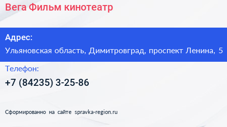 Вега Фильм, кинотеатр по адресу Ульяновская область, Димитровград, проспект Ленина, 5 в дальнейшем Организация, размещена в следующих категориях: