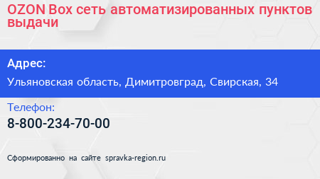 OZON Box, сеть автоматизированных пунктов выдачи по адресу Ульяновская область, Димитровград, Свирская, 34 в дальнейшем Организация, размещена в следующих категориях: