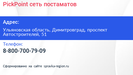 PickPoint, сеть постаматов по адресу Ульяновская область, Димитровград, проспект Автостроителей, 51 в дальнейшем Организация, размещена в следующих категориях: