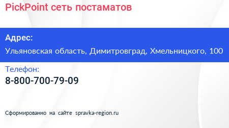 PickPoint, сеть постаматов по адресу Ульяновская область, Димитровград, Хмельницкого, 100 в дальнейшем Организация, размещена в следующих категориях: