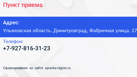 Пункт приема по адресу Ульяновская область, Димитровград, Фабричная улица, 27 в дальнейшем Организация, размещена в следующих категориях: