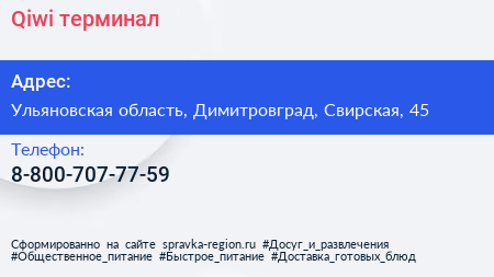 Qiwi, терминал по адресу Ульяновская область, Димитровград, Свирская, 45 в дальнейшем Организация, размещена в следующих категориях: