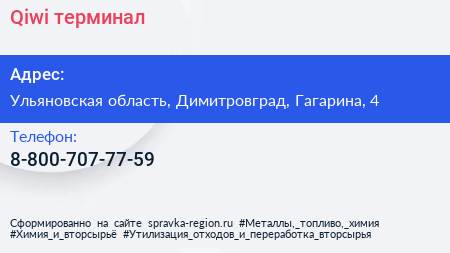 Qiwi, терминал по адресу Ульяновская область, Димитровград, Гагарина, 4 в дальнейшем Организация, размещена в следующих категориях: