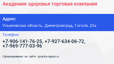 Академия здоровья, торговая компания по адресу Ульяновская область, Димитровград, Гоголя, 21а в дальнейшем Организация, размещена в следующих категориях: