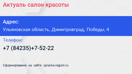 Актуаль, салон красоты по адресу Ульяновская область, Димитровград, Победы, 4 в дальнейшем Организация, размещена в следующих категориях: