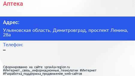 Аптека по адресу Ульяновская область, Димитровград, проспект Ленина, 28а в дальнейшем Организация, размещена в следующих категориях: