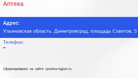 Аптека по адресу Ульяновская область, Димитровград, площадь Советов, 5 в дальнейшем Организация, размещена в следующих категориях: