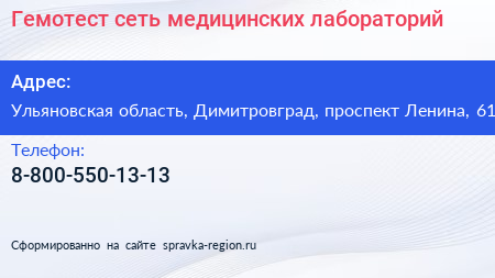 Гемотест, сеть медицинских лабораторий по адресу Ульяновская область, Димитровград, проспект Ленина, 61 в дальнейшем Организация, размещена в следующих категориях: