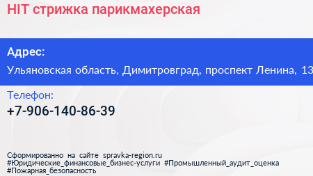 HIT-стрижка, парикмахерская по адресу Ульяновская область, Димитровград, проспект Ленина, 13 в дальнейшем Организация, размещена в следующих категориях: