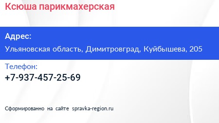 Ксюша, парикмахерская по адресу Ульяновская область, Димитровград, Куйбышева, 205 в дальнейшем Организация, размещена в следующих категориях: