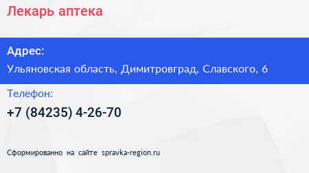 Лекарь, аптека по адресу Ульяновская область, Димитровград, Славского, 6 в дальнейшем Организация, размещена в следующих категориях: