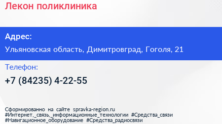 Лекон, поликлиника по адресу Ульяновская область, Димитровград, Гоголя, 21 в дальнейшем Организация, размещена в следующих категориях: