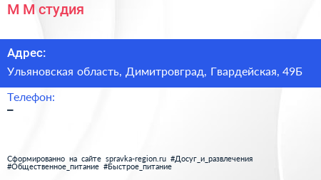 М & М, студия по адресу Ульяновская область, Димитровград, Гвардейская, 49Б в дальнейшем Организация, размещена в следующих категориях:
