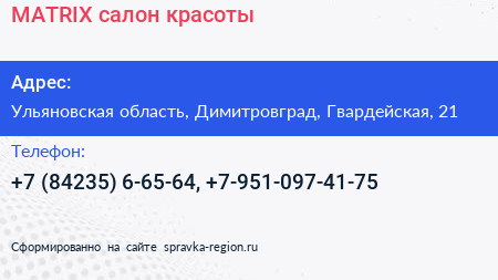 MATRIX, салон красоты по адресу Ульяновская область, Димитровград, Гвардейская, 21 в дальнейшем Организация, размещена в следующих категориях: