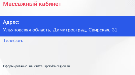 Массажный кабинет по адресу Ульяновская область, Димитровград, Свирская, 31 в дальнейшем Организация, размещена в следующих категориях: