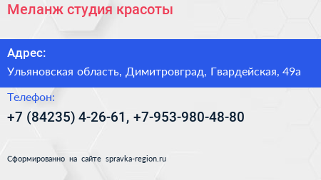 Меланж, студия красоты по адресу Ульяновская область, Димитровград, Гвардейская, 49а в дальнейшем Организация, размещена в следующих категориях:
