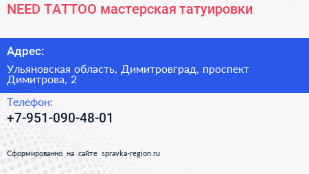 NEED TATTOO, мастерская татуировки по адресу Ульяновская область, Димитровград, проспект Димитрова, 2 в дальнейшем Организация, размещена в следующих категориях: