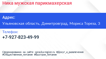 Ника, мужская парикмахерская по адресу Ульяновская область, Димитровград, Мориса Тореза, 3 в дальнейшем Организация, размещена в следующих категориях:
