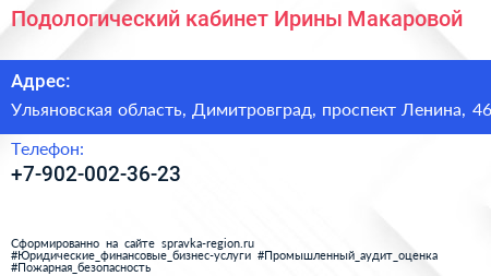 Подологический кабинет Ирины Макаровой по адресу Ульяновская область, Димитровград, проспект Ленина, 46 в дальнейшем Организация, размещена в следующих категориях: