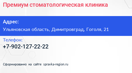 Премиум, стоматологическая клиника по адресу Ульяновская область, Димитровград, Гоголя, 21 в дальнейшем Организация, размещена в следующих категориях: