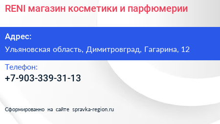 RENI, магазин косметики и парфюмерии по адресу Ульяновская область, Димитровград, Гагарина, 12 в дальнейшем Организация, размещена в следующих категориях: