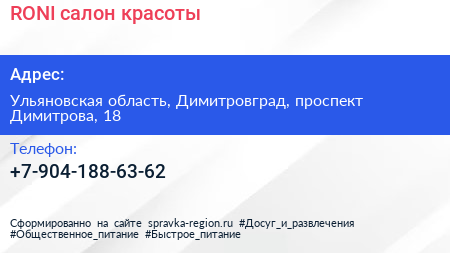 RONI, салон красоты по адресу Ульяновская область, Димитровград, проспект Димитрова, 18 в дальнейшем Организация, размещена в следующих категориях: