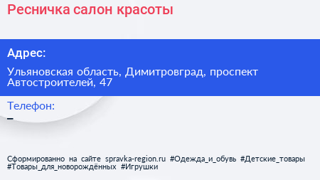 Ресничка, салон красоты по адресу Ульяновская область, Димитровград, проспект Автостроителей, 47 в дальнейшем Организация, размещена в следующих категориях: