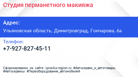Студия перманетного макияжа по адресу Ульяновская область, Димитровград, Гончарова, 6а в дальнейшем Организация, размещена в следующих категориях: