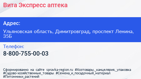 Вита Экспресс, аптека по адресу Ульяновская область, Димитровград, проспект Ленина, 35Б в дальнейшем Организация, размещена в следующих категориях: