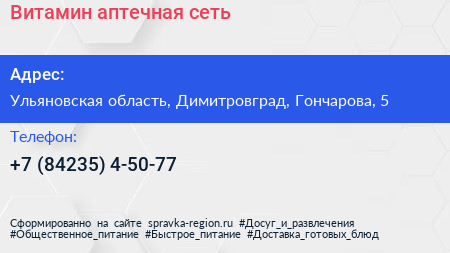 Витамин, аптечная сеть по адресу Ульяновская область, Димитровград, Гончарова, 5 в дальнейшем Организация, размещена в следующих категориях: