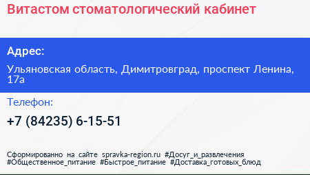 Витастом, стоматологический кабинет по адресу Ульяновская область, Димитровград, проспект Ленина, 17а в дальнейшем Организация, размещена в следующих категориях: