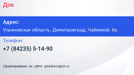 Док по адресу Ульяновская область, Димитровград, Чайкиной, 8а в дальнейшем Организация, размещена в следующих категориях:
