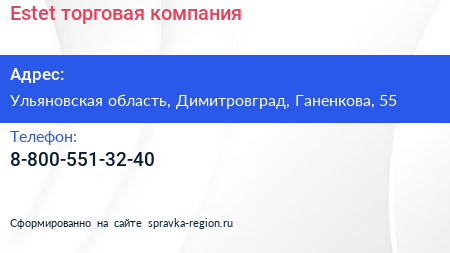 Estet, торговая компания по адресу Ульяновская область, Димитровград, Ганенкова, 55 в дальнейшем Организация, размещена в следующих категориях: