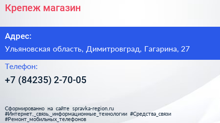 Крепеж, магазин по адресу Ульяновская область, Димитровград, Гагарина, 27 в дальнейшем Организация, размещена в следующих категориях: