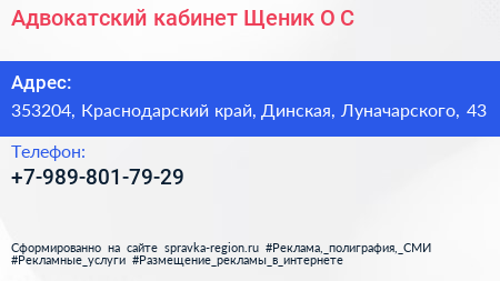 Адвокатский кабинет Щеник О.С. по адресу 353204, Краснодарский край, Динская, Луначарского, 43 в дальнейшем Организация, размещена в следующих категориях:
