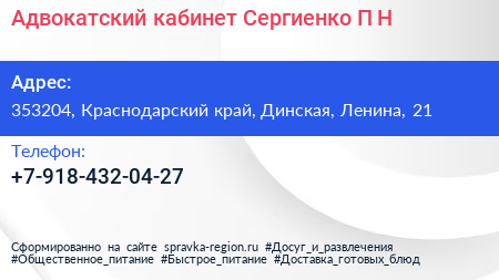 Адвокатский кабинет Сергиенко П.Н. по адресу 353204, Краснодарский край, Динская, Ленина, 21 в дальнейшем Организация, размещена в следующих категориях: