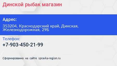 Динской рыбак, магазин по адресу 353204, Краснодарский край, Динская, Железнодорожная, 29Б в дальнейшем Организация, размещена в следующих категориях: